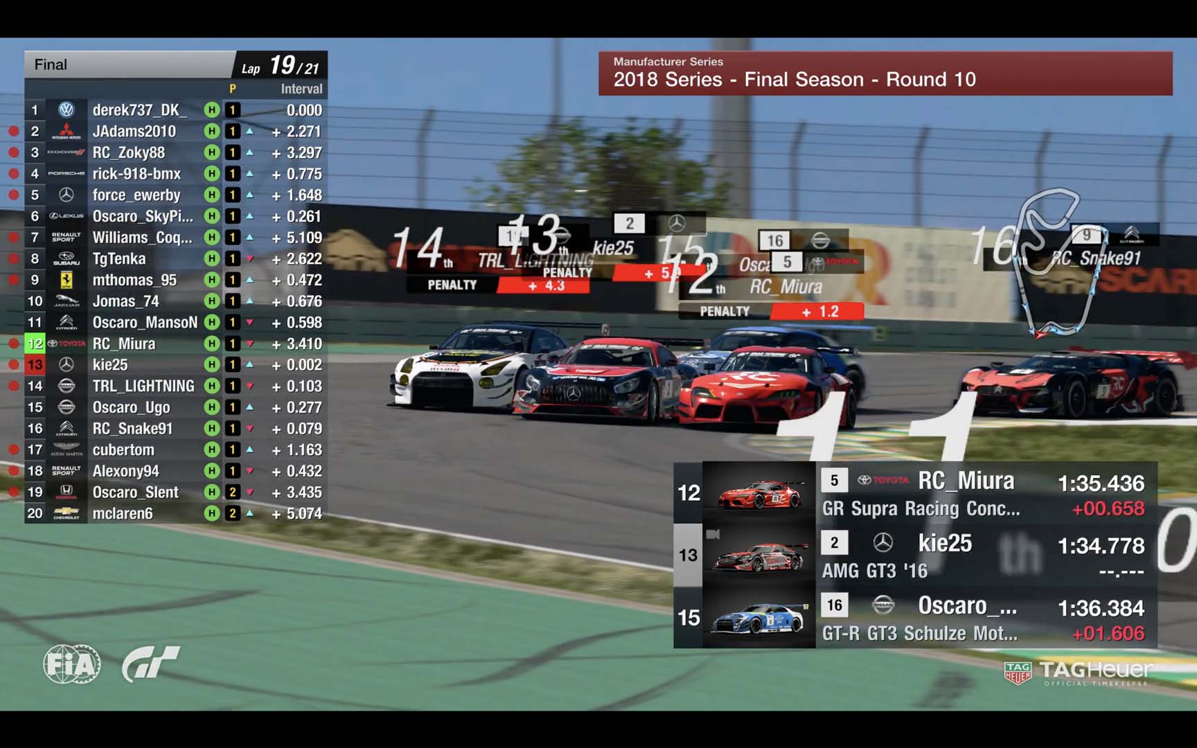 Oscaro_SkyPikmin (Lexus) foi o maior beneficiário das penalizações, saltando para quarto lugar à frente do melhor Mercedes, com force_ewerby (Mercedes) em quinto.