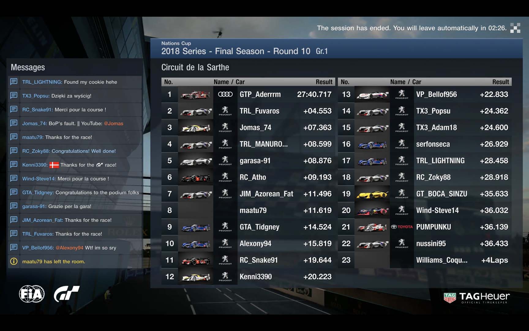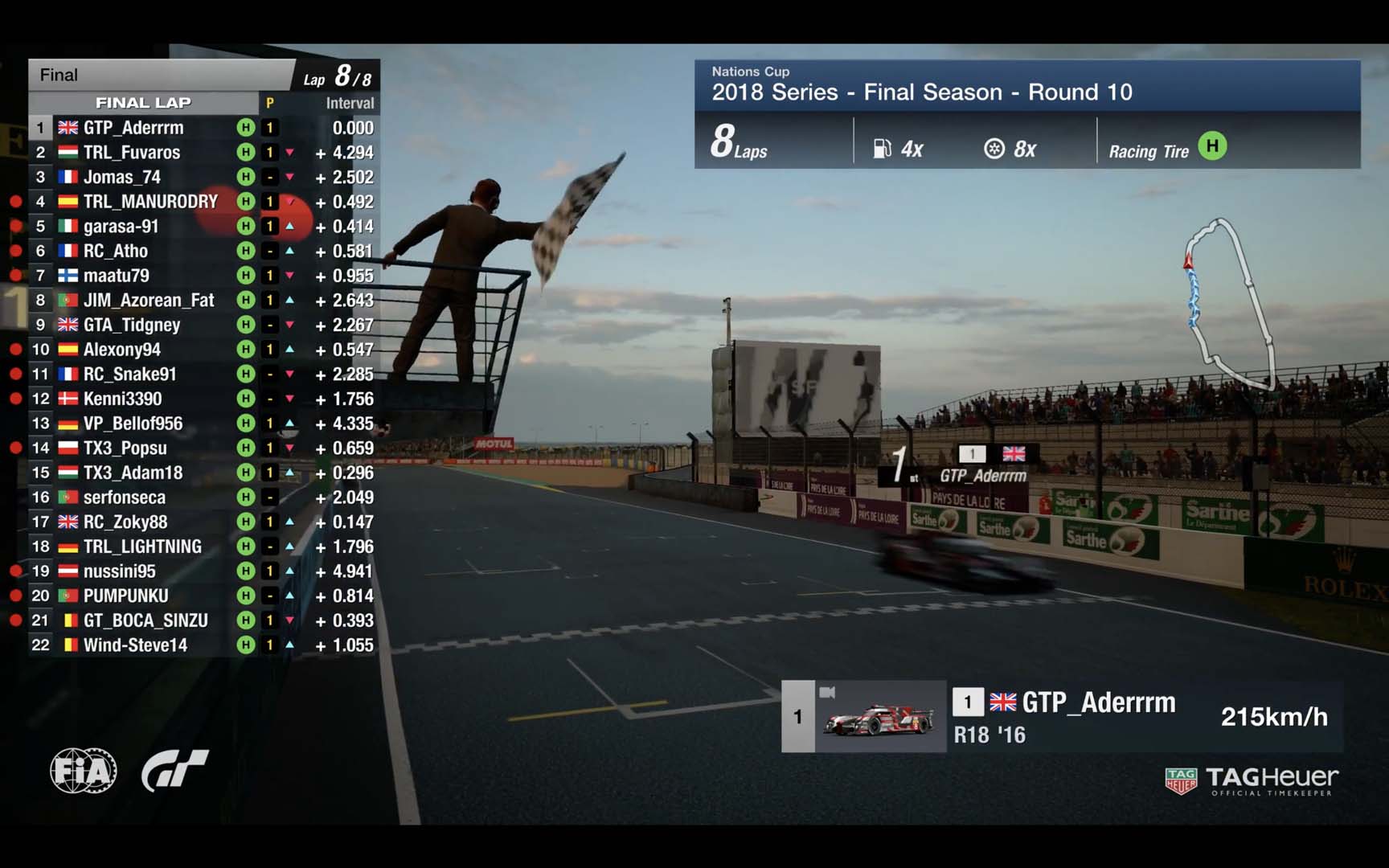 Apenas um segundo separava os três carros na frente no início da penúltima volta. GTP_Aderrrm demonstrou estar em pleno controlo do seu Audi ao serpentear por entre a dupla francesa, subindo à liderança com uma volta e meio por disputar. Jomas_74 e RC_Atho optaram por não parar nas boxes, com ambos a tentarem defender-se de TRL_Fuvaros, que tinha pneus mais frescos e um depósito de combustível cheio. Um erro a meia volta do final colocou o segundo posto de TRL_Fuvaros em risco, especialmente tendo em conta as míticas retas do circuito de Le Mans.