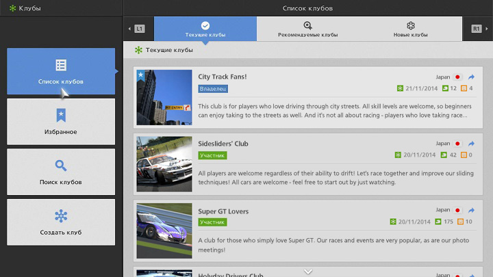 - Форум предназначен для общения членов клуба. Дискуссии ведутся в специальных темах , создавать которые может только владелец клуба. Игроки, не входящие в клуб, могут читать эти темы, однако оставлять в них комментарии разрешено только членам клуба. Число тем на форуме не может превышать 10, а каждая тема может содержать до 100 комментариев. С добавлением 10 новых комментариев сверх этого числа автоматически удаляются 10 старых. (При пользовании функциями сообщества на веб-сайте gran-turismo.com в теме может отображаться до 1 100 комментариев. С добавлением 100 новых комментариев сверх этого числа автоматически удаляются 100 старых.
