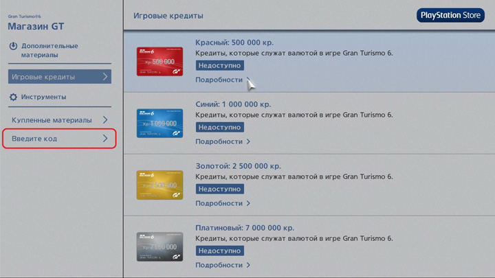 После выхода из игры или перед ее запуском выберите пункт PlayStation®Store в меню XMB™ системы PlayStation®3. Затем выберите пункт "Коды погашения" в левой части экрана и введите свой код продукта. По окончании загрузки выйдите из PlayStation®Store и запустите Gran Turismo 6. Новые автомобили будут добавлены в ваш гараж. Для просмотра новых костюмов и шлемов выберите "Гараж -> Гоночное снаряжение", а краски дополнительных цветов появятся в разделе "Краски". Обратите внимание, что кредиты не загружаются вместе с этими материалами, а зачисляются на ваш игровой счет.