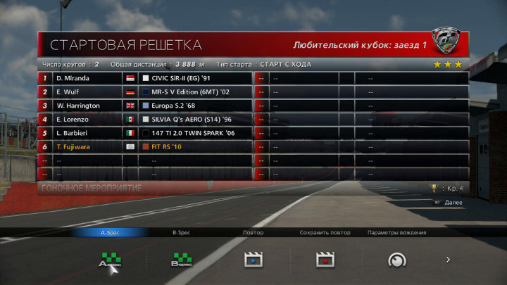 Перед началом каждого заезда на экране отображаются сведения о состоянии трассы и стартовая расстановка (для дрифт-заездов и заездов на время - рейтинговая таблица). При этом в нижней части экрана находится меню быстрого доступа, которое содержит следующие пункты (некоторые из них могут быть недоступны в зависимости от типа заезда и ситуации на трассе):