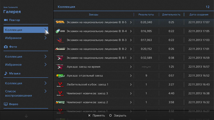 Чтобы приступить к управлению музыкой, доступной в игре Gran Turismo 6, выберите пункт "Коллекция". В правой части экрана появится список композиций. Чтобы прослушать композицию, выберите кнопку воспроизведения справа от ее названия. Нажав кнопку SELECT, вы увидите меню с пунктами "Добавить в список для трассы", "Добавить в список для меню" и "Добавить в список для слайд-шоу".