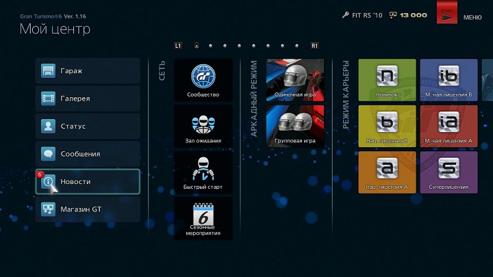На экране "Новости" содержатся сведения об обновлениях игры Gran Turismo 6 и другие уведомления. При появлении свежих новостей на значке "Новости" на экране "Мой центр" появится красный круг с указанием их количества. Выбрав этот значок, вы перейдете на экран новостей раздела "Сообщество".
