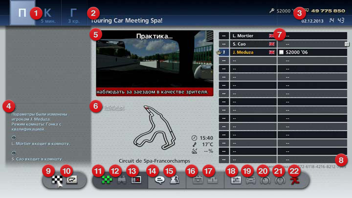 - Сетевые идентификаторы игроков, находящихся в комнате, а также названия их машин. Идентификатор текущего владельца комнаты отмечен значком короны.