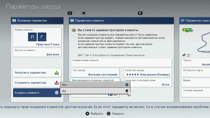 В режиме зала ожидания игрок, создавший комнату, становится ее владельцем. При этом право владения может быть фиксированным или переходящим в зависимости от параметров комнаты. При выборе между этими двумя вариантами следует учитывать пропускную способность канала и тип NAT. Подробнее об этом рассказано ниже. Дополнительные сведения о пропускной способности и типах NAT содержатся на странице "Повышение качества сетевых заездов".