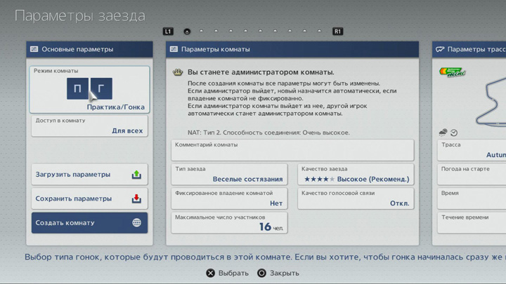 Выбрав пункт "Создать" на экране списка комнат в режиме зала ожидания, вы перейдете на экран создания комнаты. Этот экран делится на несколько блоков: основные параметры, параметры комнаты, параметры трассы, параметры квалификации, параметры гонок/заездов на время/дрифт-заездов/свободных заездов/гонок на выносливость, способ выбора машин, фильтр по характеристикам и ограничения параметров вождения (блок параметров квалификации доступен только в том случае, если для параметра "Режим комнаты" в блоке основных параметров выбрано значение "Практика/Квалификация/Гонка" или "Практика/Квалификация/Гонка на выносливость".