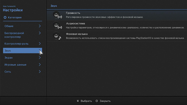 - Настройка параметров, связанных с фоновой музыкой и списками воспроизведения системы PlayStation®3. Благодаря функции "Фоновая музыка" вы можете слушать композиции из раздела "Музыка" меню XMB™ системы PlayStation®3 во время заездов, использования меню и просмотра слайдшоу. Поддерживаются форматы ATRAC/AAC/MP3/WAV/WMA и частоты дискретизации 48 кГц/44,1 кГц/22,05 кГц. Если вы хотите слушать фоновую музыку во время сетевых заездов, отключите голосовую связь.