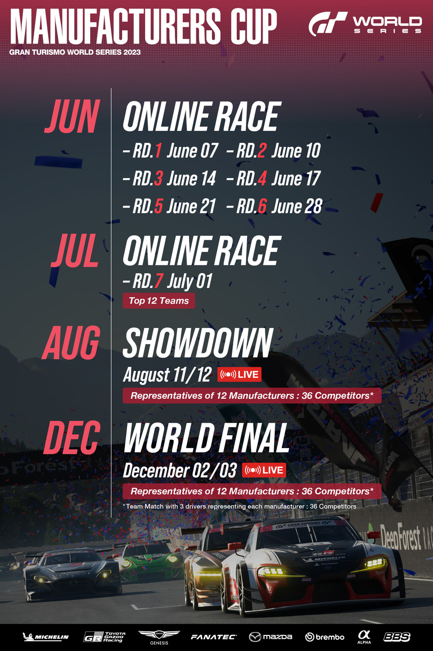 Серия Manufacturers Cup начнется 7 июня, примерно через месяц после старта Nations Cup. По итогам 7 раундов интернет-серии 12 автомобильных марок, занявших первые места в Глобальном рейтинге производителей, вместе с нашими партнерами Toyota, Genesis и Mazda перейдут в Промежуточный финал World Series, а потом и в Мировой финал.
