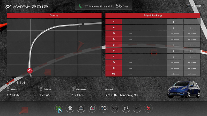 The "GT Academy 2012" is an entry level version of "Gran Turismo" that teaches you sports driving techniques through repeating simple challenges. It can be downloaded for free from the PlayStation® Store, and enjoyed by anyone.