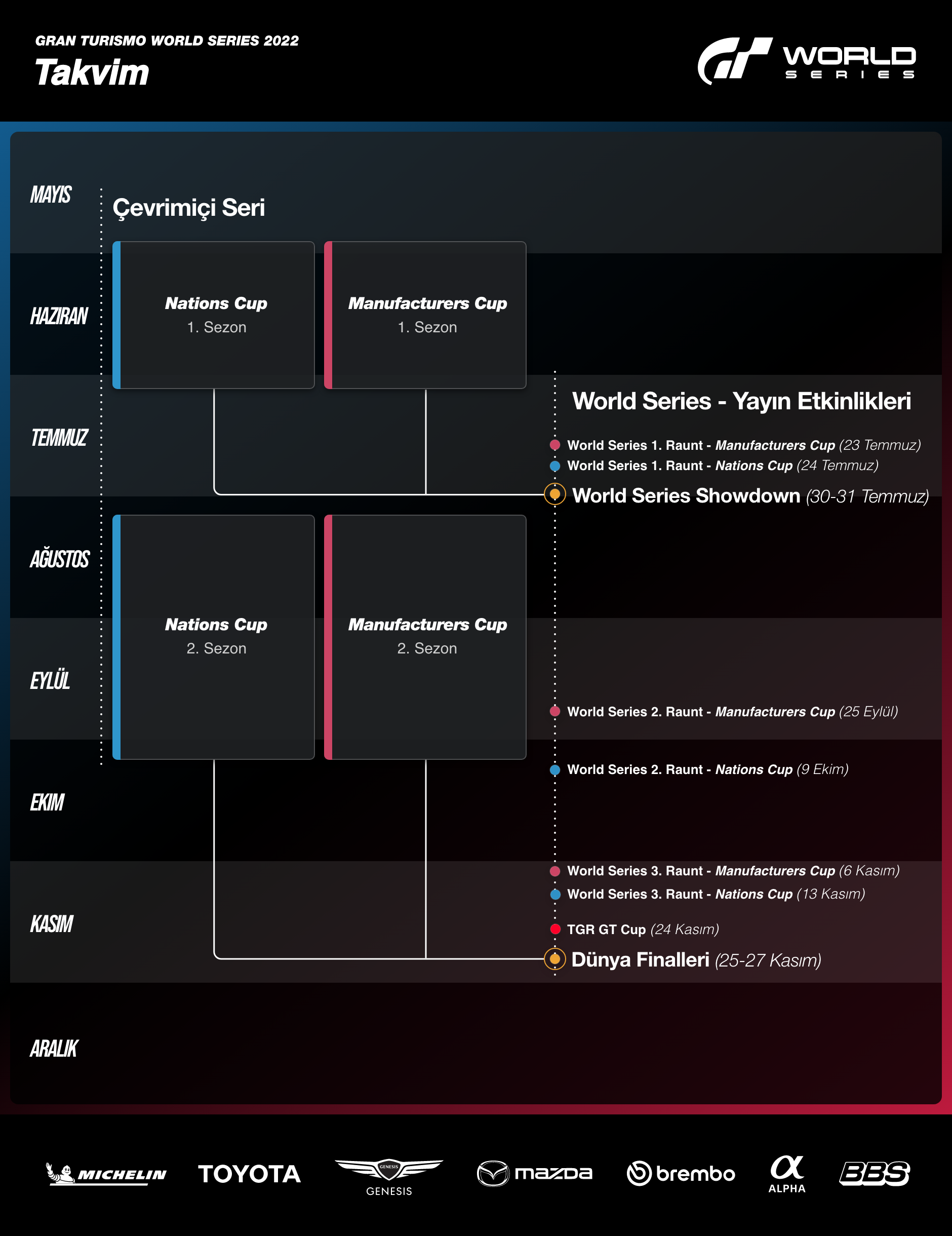 | Temsilci Sürücüler | 2021 World Finals etkinliğine katılan ve 2022 Çevrimiçi Seri’nin 1. Sezonunda aynı üreticiyi seçen yarışmacılardan, temsilciler şu şekilde seçilecektir: 1. Nihai Sıralamanın sırasında 2021 World Finals katılımcılarından. Eğer nihai sıralama eşitse, sıralama, önce büyük Büyük Finalden, sonra 2. Yarıştan ve son olarak da 1. Yarıştan elde edilen sonuçlara göre belirlenir. 2. Eğer bir yarışmacı yukarıdaki kriterlere göre seçilemezse, Polyphony Digital Inc. 2022 Çevrimiçi Seri’nin 1. Sezonunda ilgili üretici ile katılan bir yarışmacıyı, yarış sonuçlarına göre seçecektir. 2021 World Finals’da yarışmayan Genesis’in temsilci sürücüsü Çevrimiçi Seri 1. Sezon’un (1. Raunt) ilk sıradaki sürücüsü olacaktır.> |