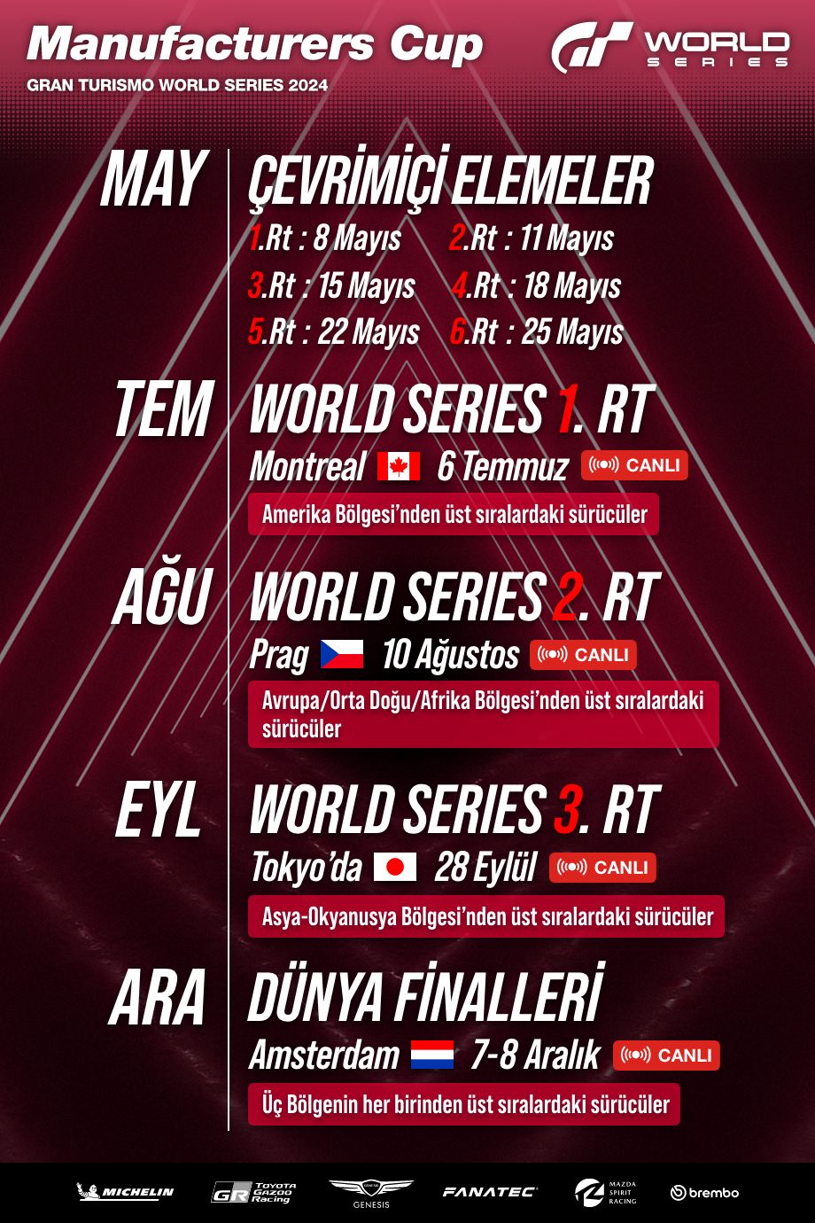 2024 Serisi (aşağıya bakın) Resmî Ortak Üreticileri ve Çevrimiçi Elemeler sonunda hesaplanan GT1 Ligi "Küresel Üretici Sıralaması"ndaki en iyi üreticilerden oluşan toplam 12 üretici, World Series Rt. 1-3 yarışlarına yükselir.