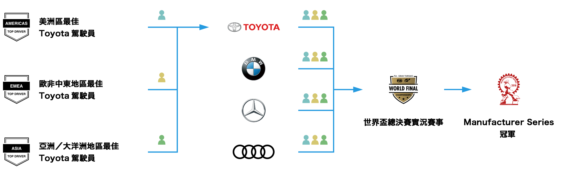 對於Manufacturer Series,線上最終賽季的結果會直接決定全球車廠排名,位居前16名的車廠將獲選晉級「世界盃總決賽」。各地區隸屬於獲選的16家車廠的頂尖玩家,可參與「世界盃總決賽」活動(來自3個地區共3名玩家)。