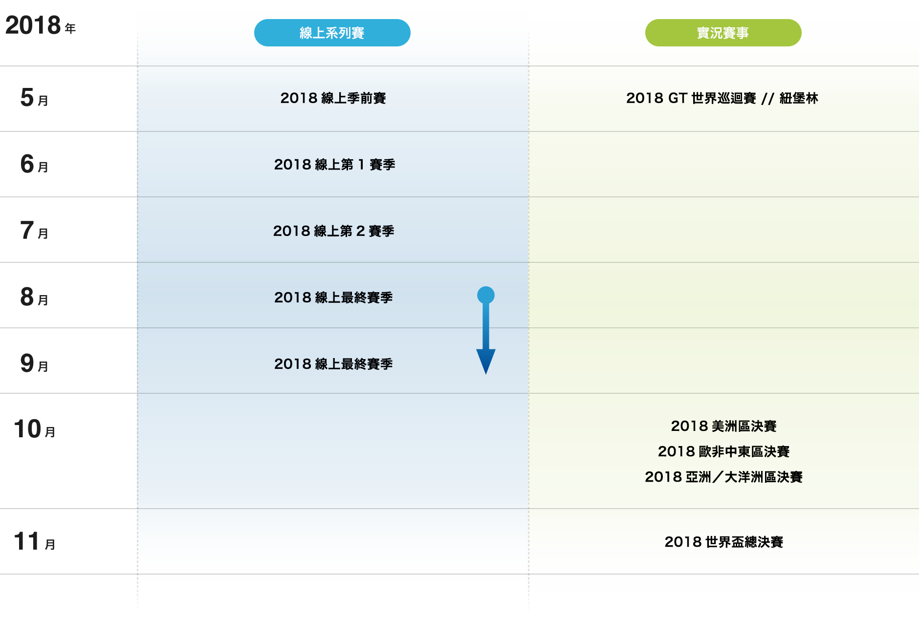 錦標賽的線上系列賽會於《Gran Turismo Sport》的「競技」模式中推出,共可分為季前賽(五月)、第一賽季和第二賽季(六月至七月),以及決賽賽季(八月至九月)。