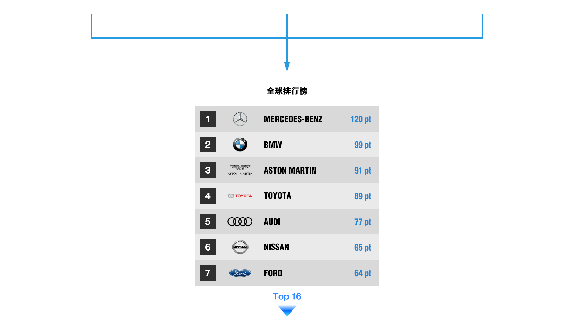 將各家車廠在3個地區所獲得的分數加總後,全球車廠排名就此出爐。