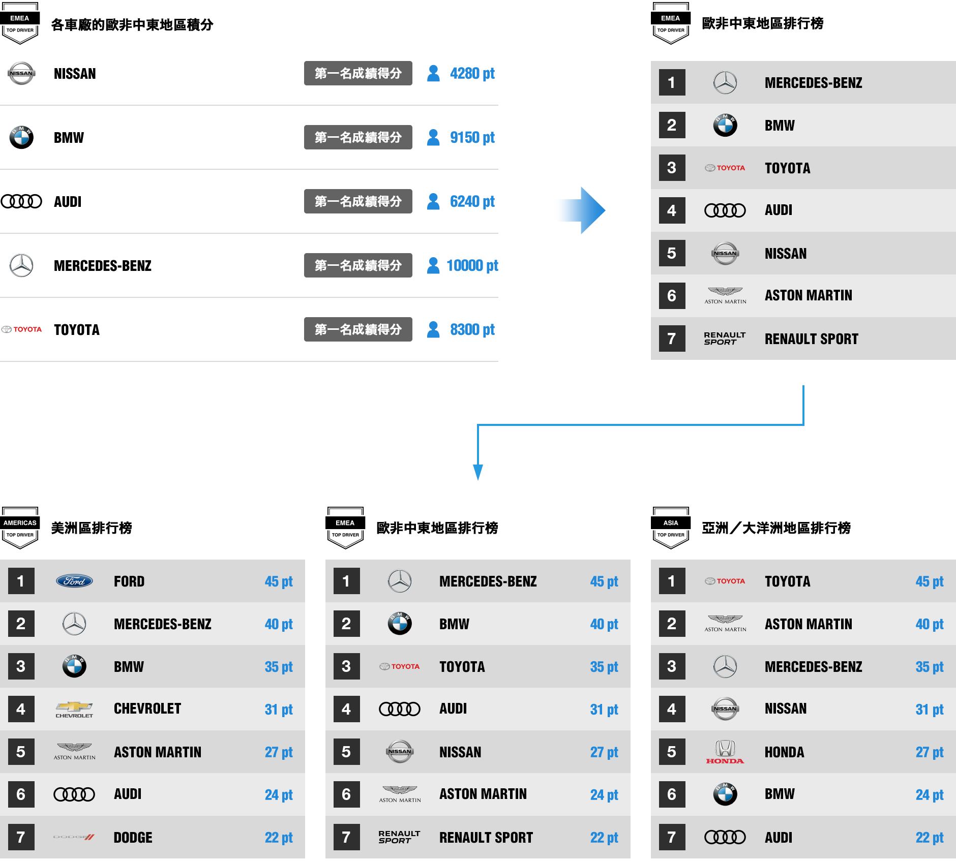 對於每個地區的線上最終賽季,各家車廠排行榜上的頂尖玩家所獲得的積分,都會計入該車廠的總分。