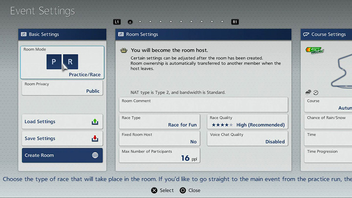 - Set Race Type. This setting does not change how the game works - it is merely intended to help players decide which room to use. As such, it is recommended that it accurately describes the room, and the type of races you wish to hold.