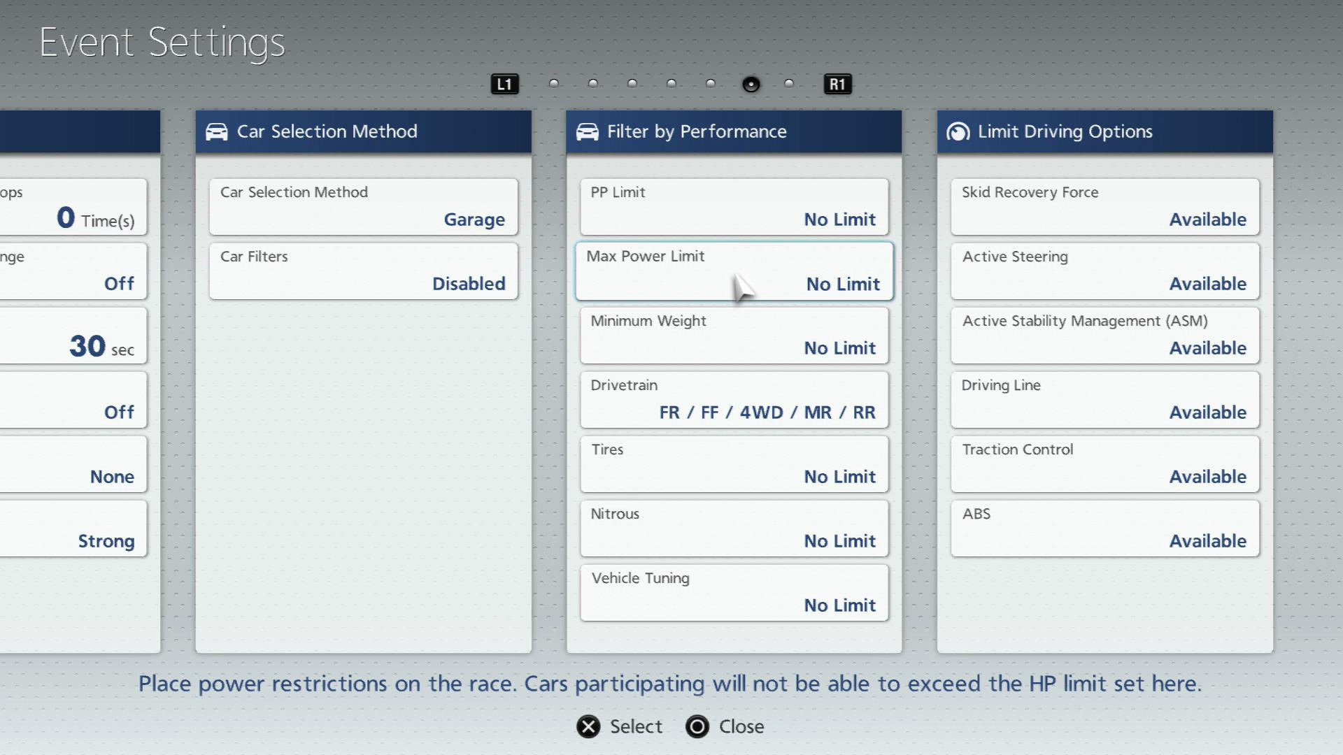 - Place power restrictions on the race. Cars participating will not be able to exceed the horsepower limit set here.