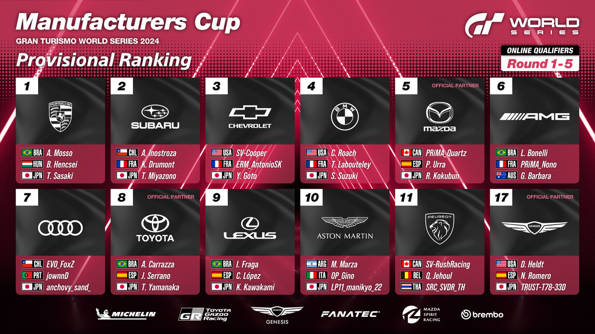 A total of 12 manufacturers will advance to World Series Rounds 1 through 3. These include the Official Partners for the 2024 Series (Toyota, Genesis, and Mazda) as well as the highest-ranked manufacturers in the Global Manufacturer Ranking of the GT1 League at the culmination of the Online Qualifiers.