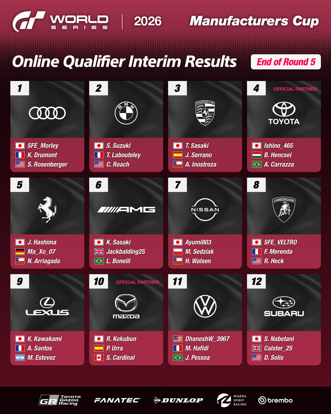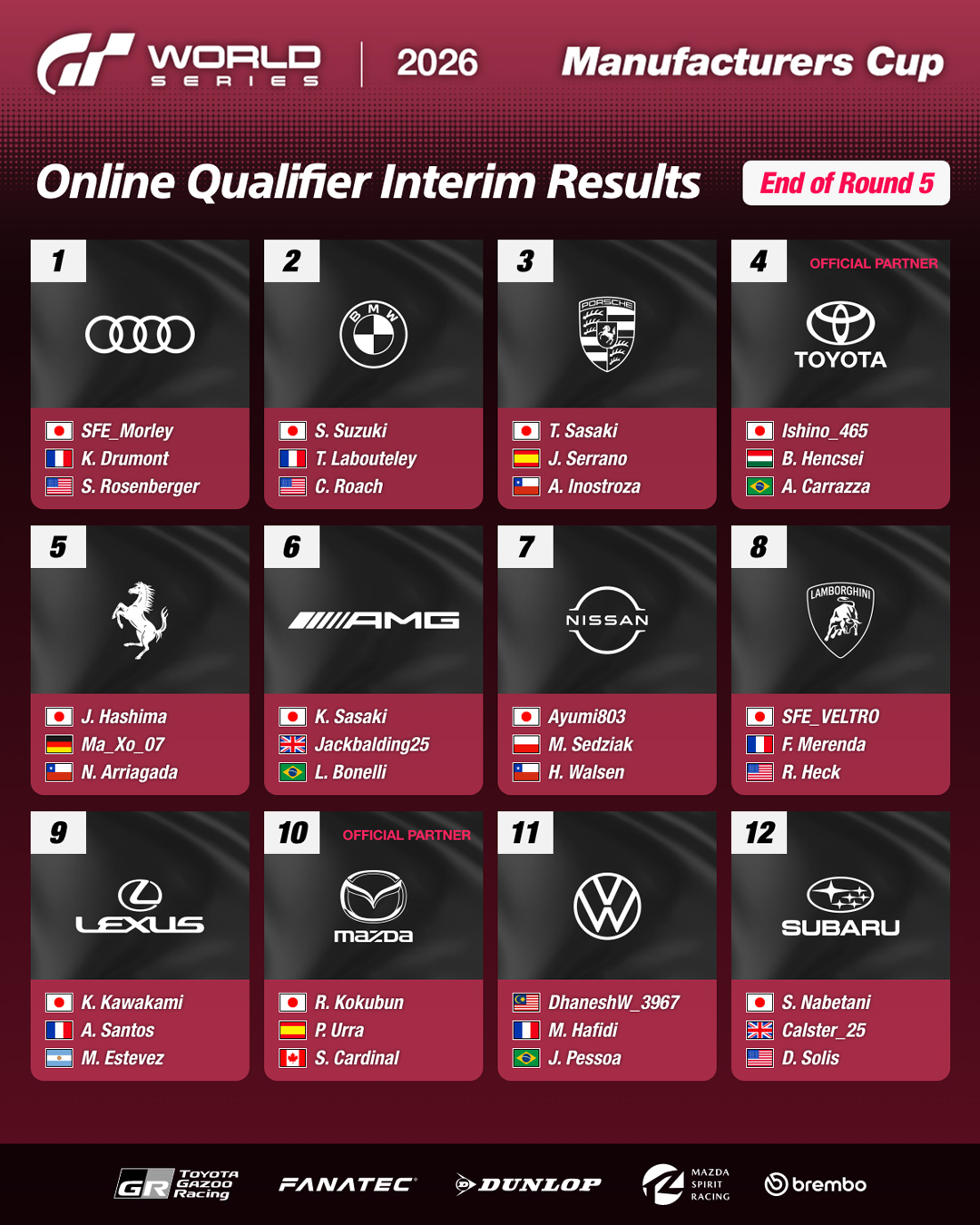 The mid-series standings following Round 5 of the Gran Turismo World Series 2026 Online Qualifiers for the Manufacturers Cup were announced on Wednesday, January 28. At that stage of the competition, the twelve leading manufacturers—and their representative drivers—were as follows.