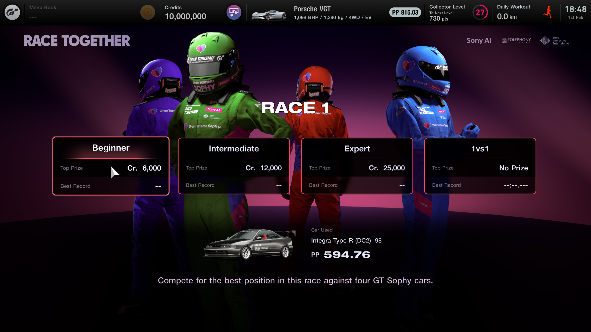 Race Together will match players against GT Sophy agents in races of different difficulty levels on four different tracks, or players can choose to go 1-on-1 with GT Sophy in an equal-conditions race. Experience wheel-to-wheel racing action like never before. As the race unfolds, GT Sophy will also express itself to the player with emoticons.