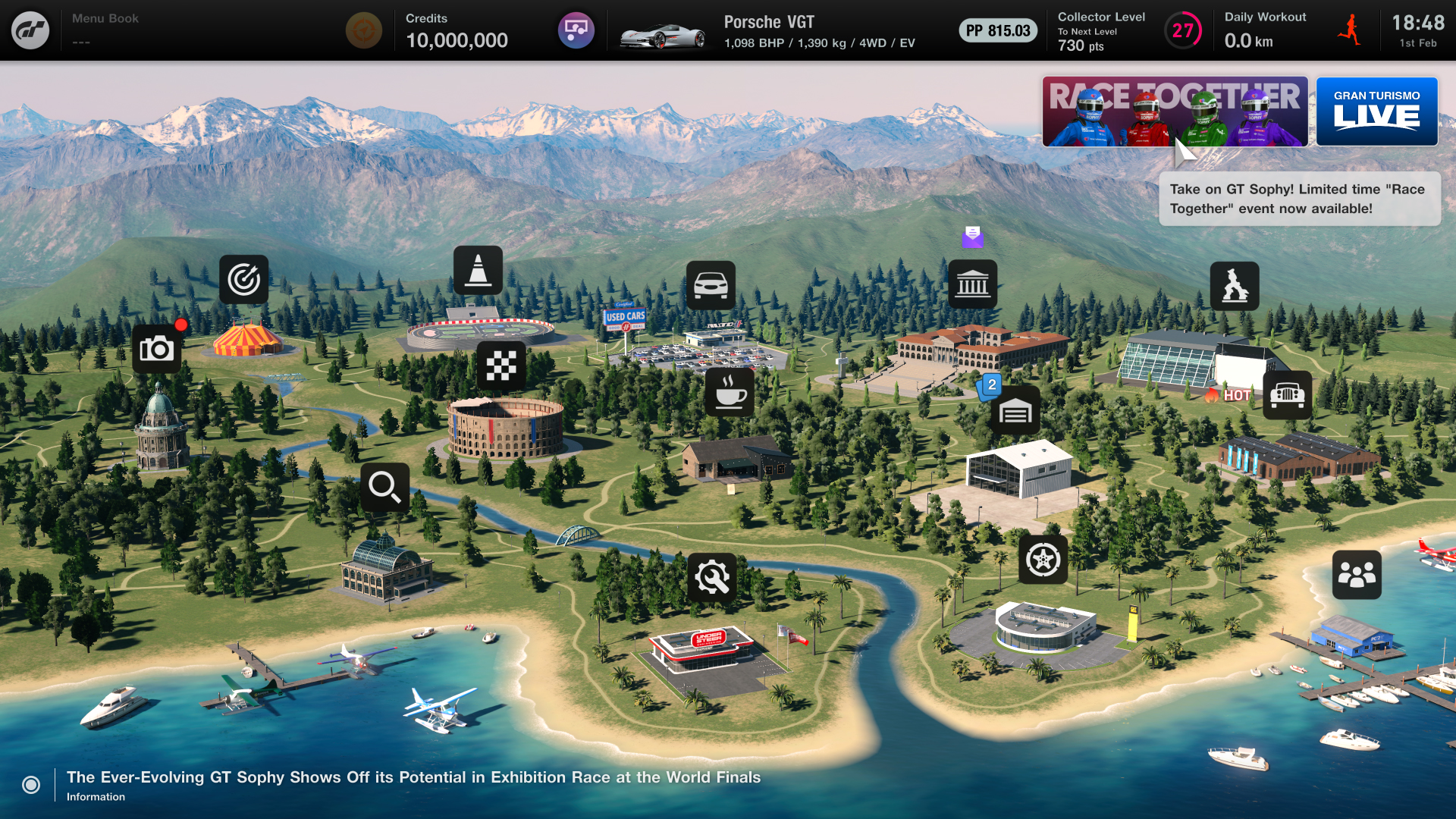 "Race Together" is a limited time event that will be available until late March. Here, players of all skill levels can experience racing against Gran Turismo Sophy (GT Sophy), an AI racing agent developed in collaboration by Sony AI, Sony Interactive Entertainment, and Polyphony Digital. This game mode can be accessed from the banner at the top right of the World Map during the event period. Please note that the feature is available only on the PS5™ console version of the game and is unlocked after reaching Collector Level 6.
