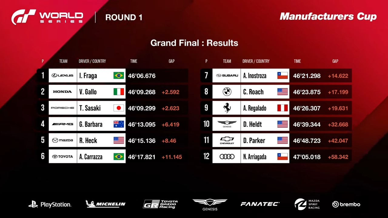 The "Gran Turismo World Series" 2024 Round 1, the premier international Esports race series that feature the best virtual drivers in the world, just concluded in Montreal, Canada. The action-packed first round saw more than a few surprises. The top three finishers from the Nations Cup and Manufacturers Cup are listed below.