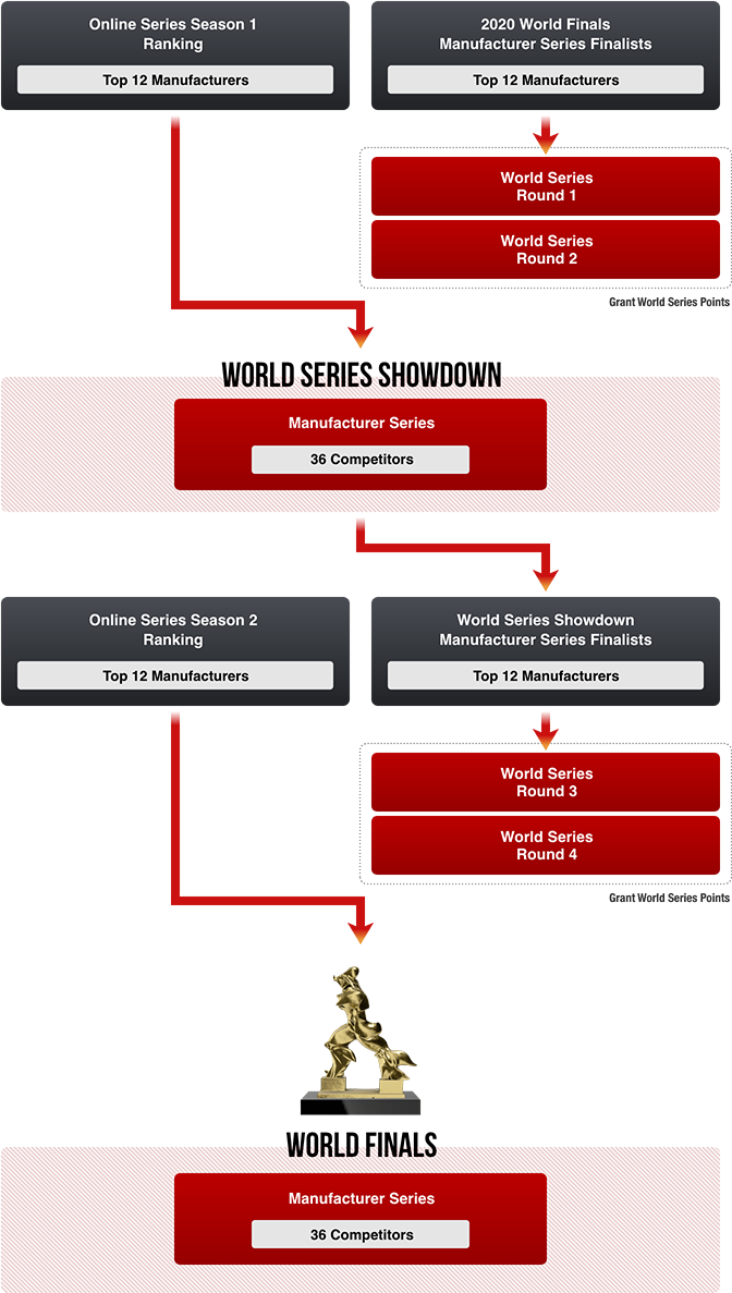 In each World Series Round, the top three competitors and teams for both Nations Cup and Manufacturer Series are awarded "World Series Points." The World Series Points will be added as initial starting points in the World Finals rankings.