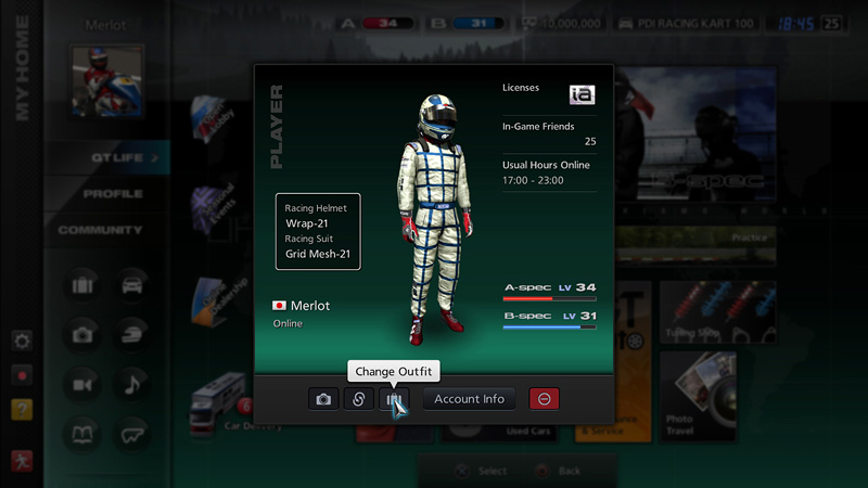 A new racing gear category with racing helmets and racing suits has been implemented. You can use these for your A-Spec driver or any of the "My Drivers" in B-Spec. There are many variations to the racing gear, and in addition to several sets being given out as gifts when you start GT Mode, you can also gain new ones when you win in online events. You can even take a photo of your driver wearing your favorite gear, and use that custom photo for your driver profile.